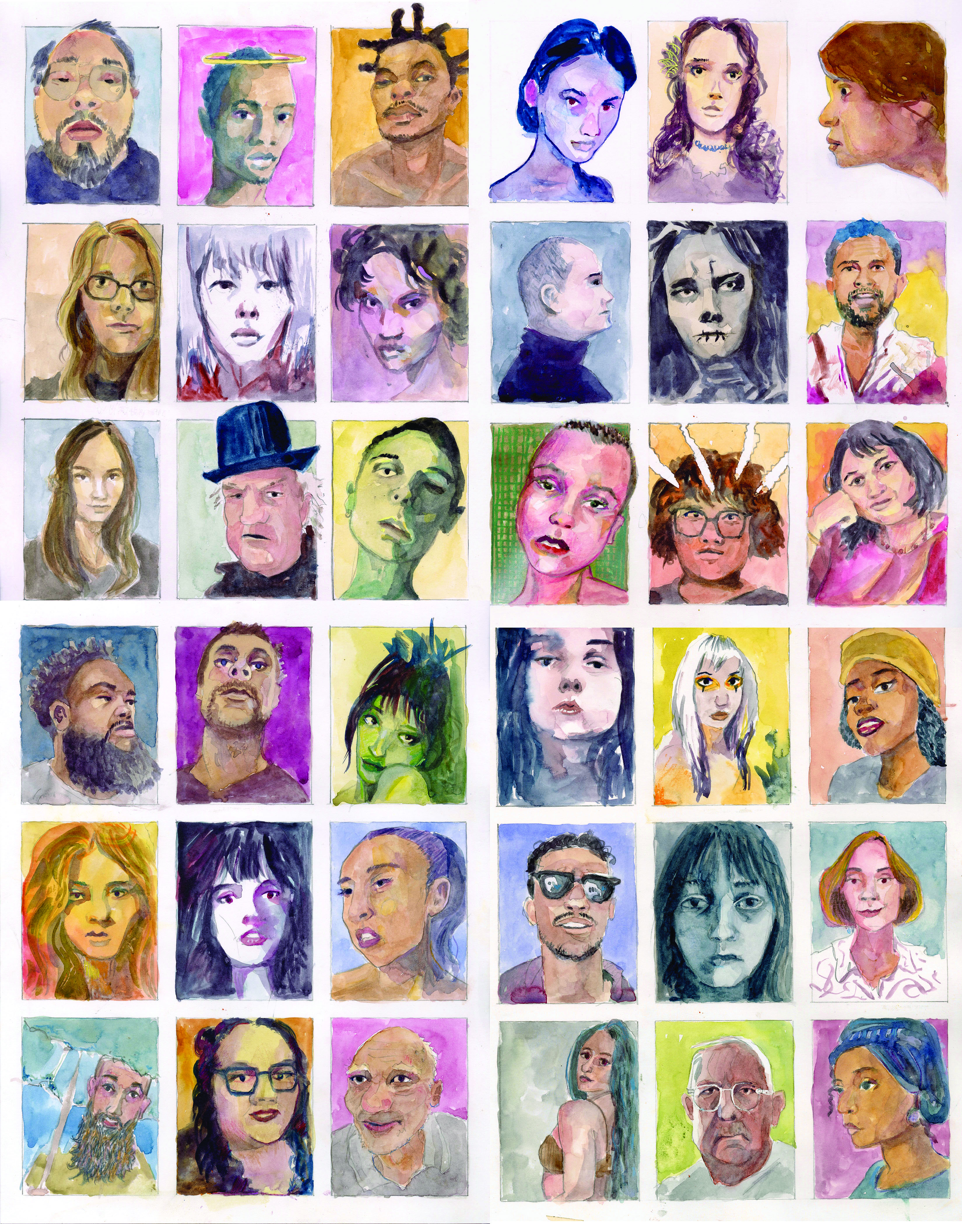 Richard Graves, watercolorist, Abingdon, Virginia, created a polyptych for the “From These Hills” exhibit at William King Museum of Art, Abingdon, Virginia. Entitled “Faces of Strangers,” it is 36 watercolor portraits each with a story to tell.
