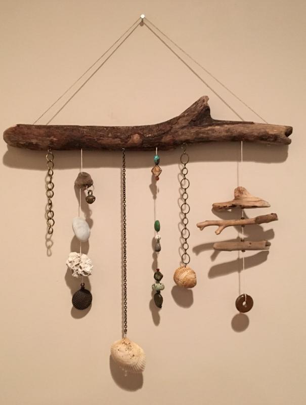 Artist statement: "My driftwood creations have been inspired by years of collecting driftwood from my home state of Vermont. The driftwood is sourced from a magical place on Lake Champlain, which consistently provides beautiful pieces of lake-worn wood perfect for creations. My shells come mostly from Asia, where I spent over 20 years. My daughter's unused glass and metal beads and recycled jewelry have all found their way into my shop. I kept collecting until I found the time to create with these beautiful pieces. I love the warmth these pieces bring to a home in their unique and special places."