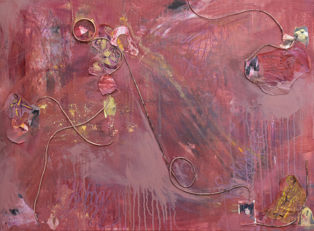 Shay: My work is abstract, descriptive and linguistic. I create mixed-media collage paintings on canvas about my identity, my insecurities, my connection with others and accepting myself as I am. When I start my collages, I start with a blank white canvas and start writing in graphite on it about whatever that piece will be about, then I emphasize certain words or phrases and create another layer of writing with paint pen, charcoal, chalk pastels or markers. This writing, which is made up of quotes, poetry, fiction etc., is more often than not illegible to the viewer and can be backwards, upside down, in any direction or overlapping. After my writing layers are finished, I will do a wash of two to three colors of acrylic paint. After drying, I will write back into it and do a more opaque layer of paint, and so on. After these layers of writing and painting are finished, I will collage paper, twine, glass, embroidery and other materials onto the canvas, and then I will do one or two more cycles of writing and painting.