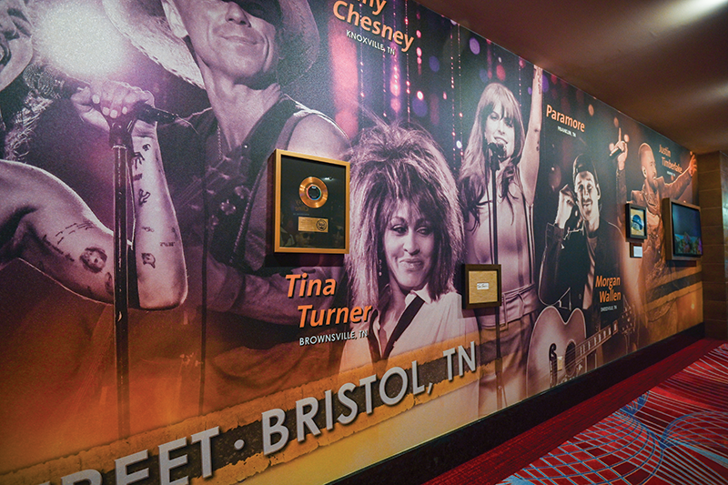 A few of the favorites in the Bristol casino include Dolly Parton’s custom Trang Phung dress (Wendy Williams Show), Johnny Cash’s “Man in Black” ensemble, Lady Gaga’s London appearance dress, Stevie Nicks’s autographed pearl-trimmed glove, Farm Aid XI guitar signed by Willie Nelson, Neil Young and John Mellencamp, Steven Tyler’s Back in the Saddle Tour outfits, Elvis Presley handwritten set list and Faith Hill’s 1960 convertible Corvette. “State Stree” is a corridor with artists from Tennessee on one side and those from Virginia on the other. The portraits are accompanied by memorabilia, such as gold records, set lists and more.