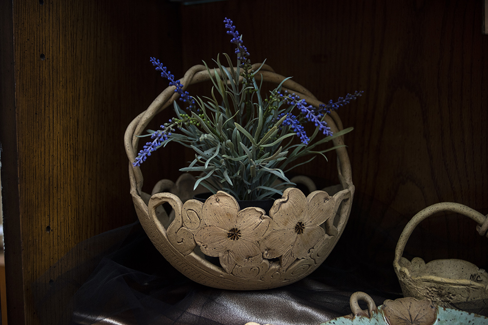 “Two years ago, when the pandemic started and the dogwood started blooming, I go out like an idiot and start making all these dogwood baskets. The shows were canceled, but I was entertaining myself playing with my pottery. This year when the dogwood started blooming, I slapped my hand and only made a few, because I still had all those from last year in my garage,” she says.