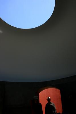 James Turrell's "Three Gems" is located in the Osher Sculpture Garden of the museum. Taking the form of a stupa, it is a concrete and red plaster cylindrical structure that is domed with a circular opening in its roof. When sitting around the circumference inside, the circle of sky above becomes the experience. The color and light of the sky, of course, changes during daylight and fades to starlit at night. Entry to this diminutive Pantheon is via a tunnel and arched doorway. LED lighting is an additional element.